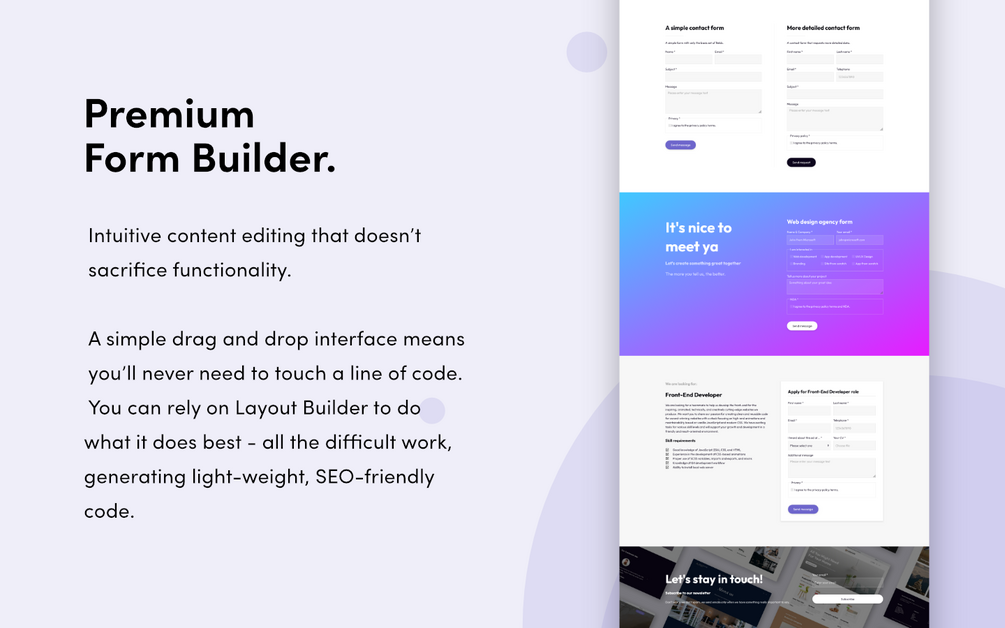Create pages in any way you like, there are endless possibilities. A simple drag-and-drop interface means you’ll never need to touch a line of code. You can rely on Layout Builder to do what it does best - all the difficult work, generating lightweight, SEO-friendly code.